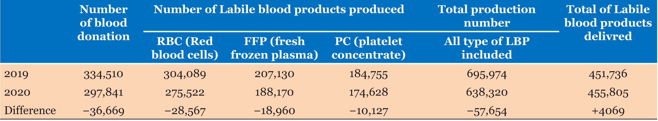 On 2019, 1,800,236 blood collections were made in those countries but on 2020 1,498,773 blood collections were made with −301,463 as a difference [30]. Blood requested and delivered for transfusion has declined in 30 countries. The risk of out-of-stock reagents and consumables used along the blood transfusion chain, from blood collection to transfusion to patients, increased in 11 (29.7%) countries in 2019 to 22 (59.5%) in 2020. Ten countries reported some convalescent plasma activity. However, very few units of these collected products have been transfused to patients with COVID-19 [30].